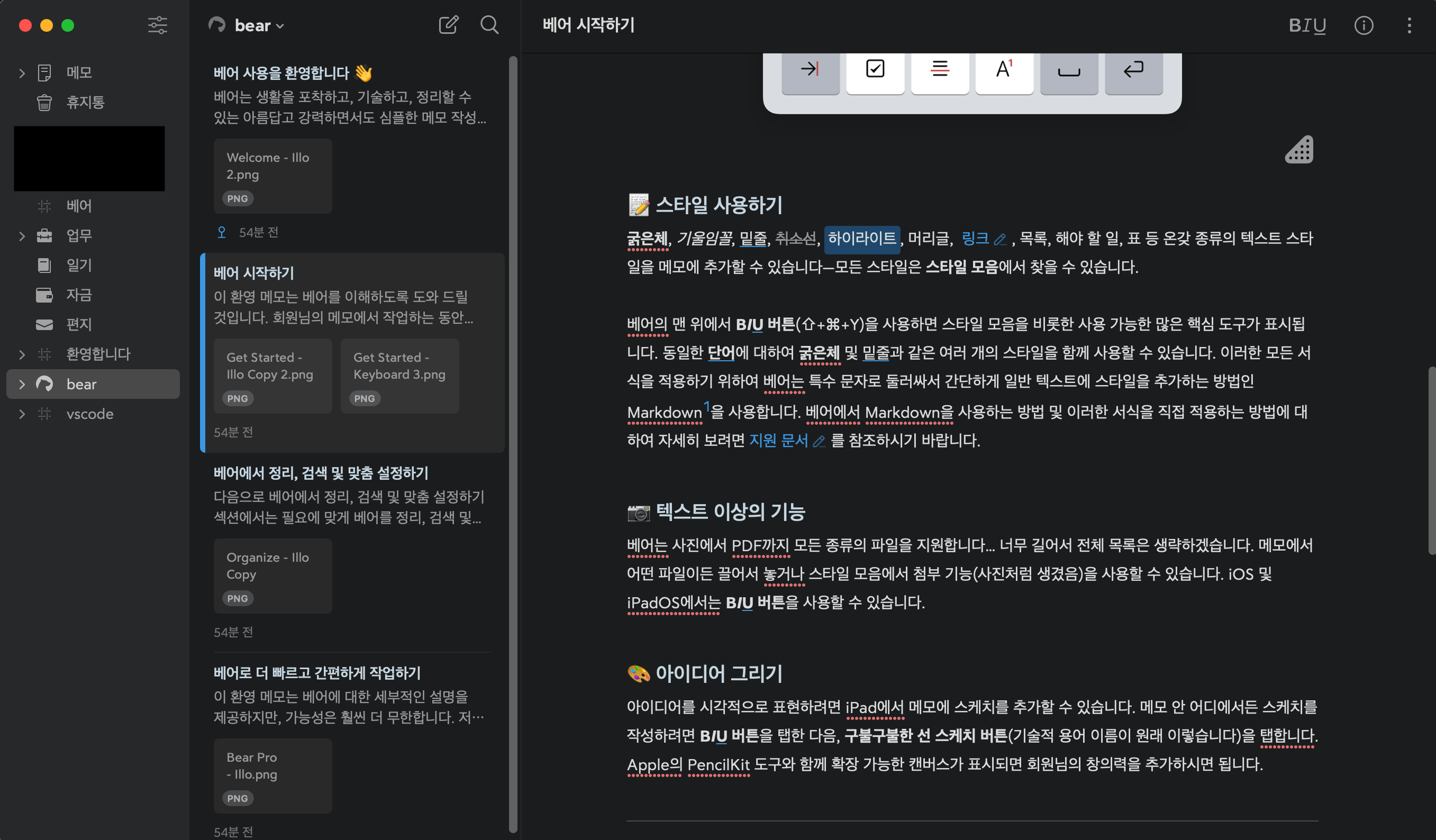 먼저 소개드릴 메모 앱은 베어입니다. 지금까지도 아주 요긴하게 사용하고 있는 앱중 하나입니다. 체계적으로 정리하기 좋고 개발 이외의 작업을 정리하고 메모하는데 편하고 빠르게 입력이 가능합니다. 그리고 앱을 잠그는 기능이 있어 민감한 자료들도 넣어 놓을 수 있어 장점이라고 볼 수 있습니다.
