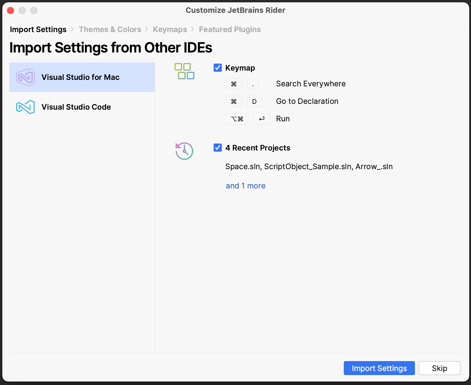이후에 실행하면 위와 같은 세팅을 임포트를 할수 있는데 저는 visual studio 세팅을 그대로 가져옵니다.