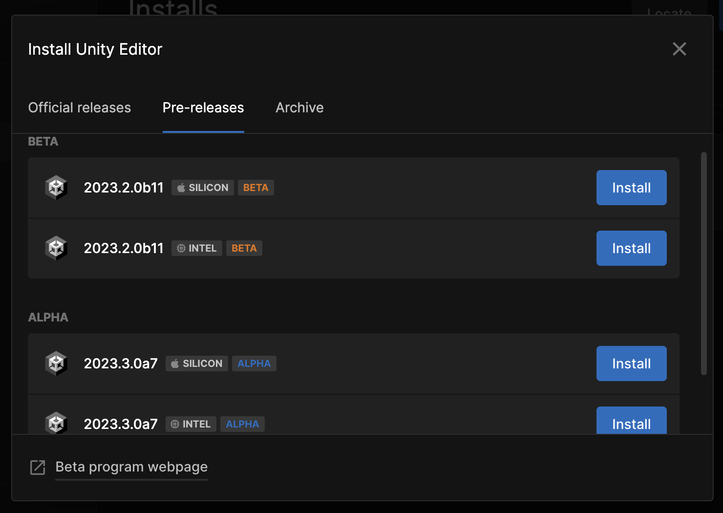 unity hub에서 Pre-releases 항목에 베타 버전과 알파 저번이 나란히 나와있는 것을 볼 수 있습니다. 버전명을 보시다 싶이 베타 버전이 이제 곧 나오게 될 버전의 베타 버전이고 알파는 조금 더 먼 시점에 나오게될 버전의 테스트 버전입니다. 원하시는 버전을 다운을 받으면 되겠습니다.