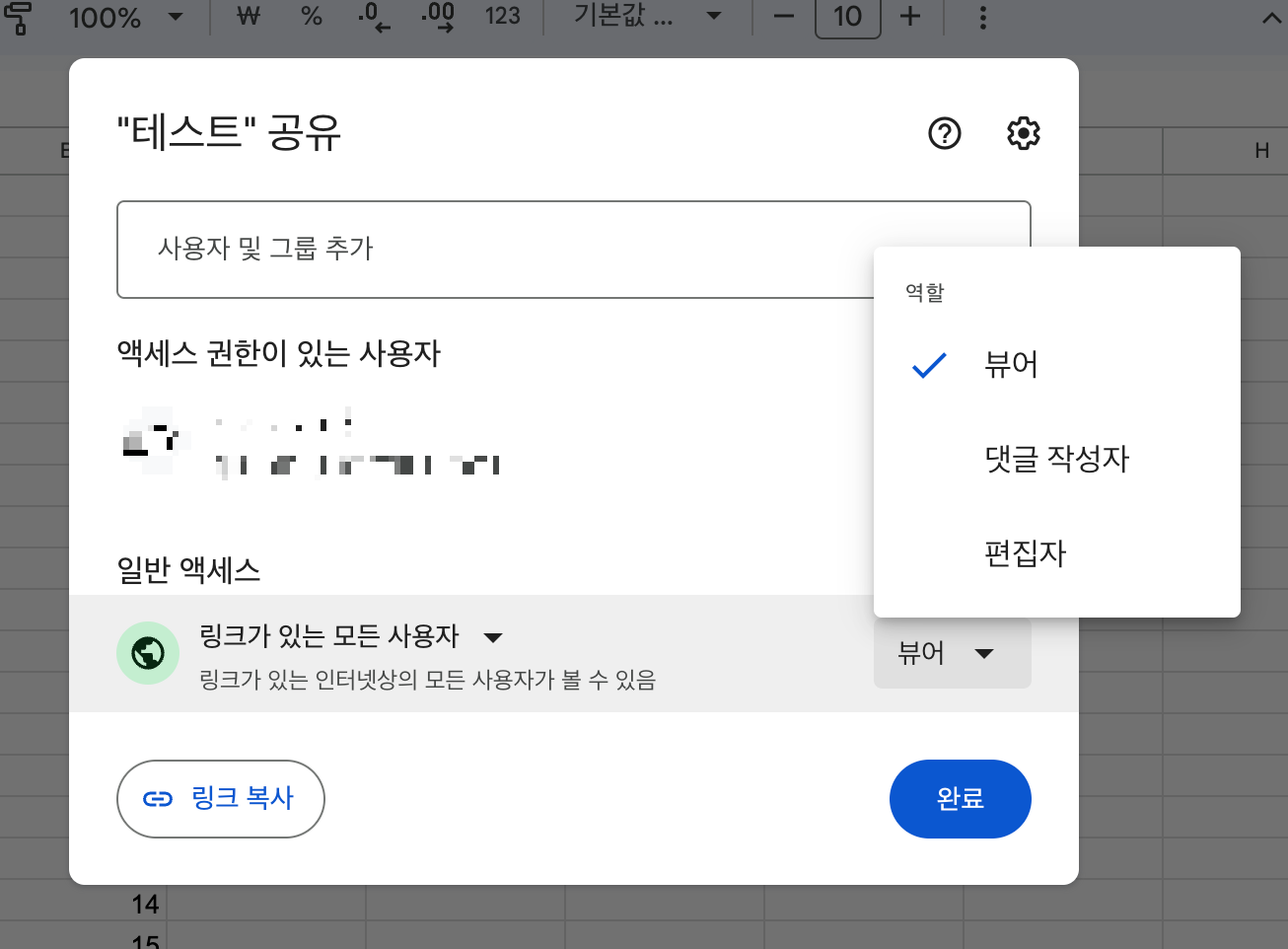 뷰어, 댓글 작성자 , 편집자를 선택을 할 수 있습니다.