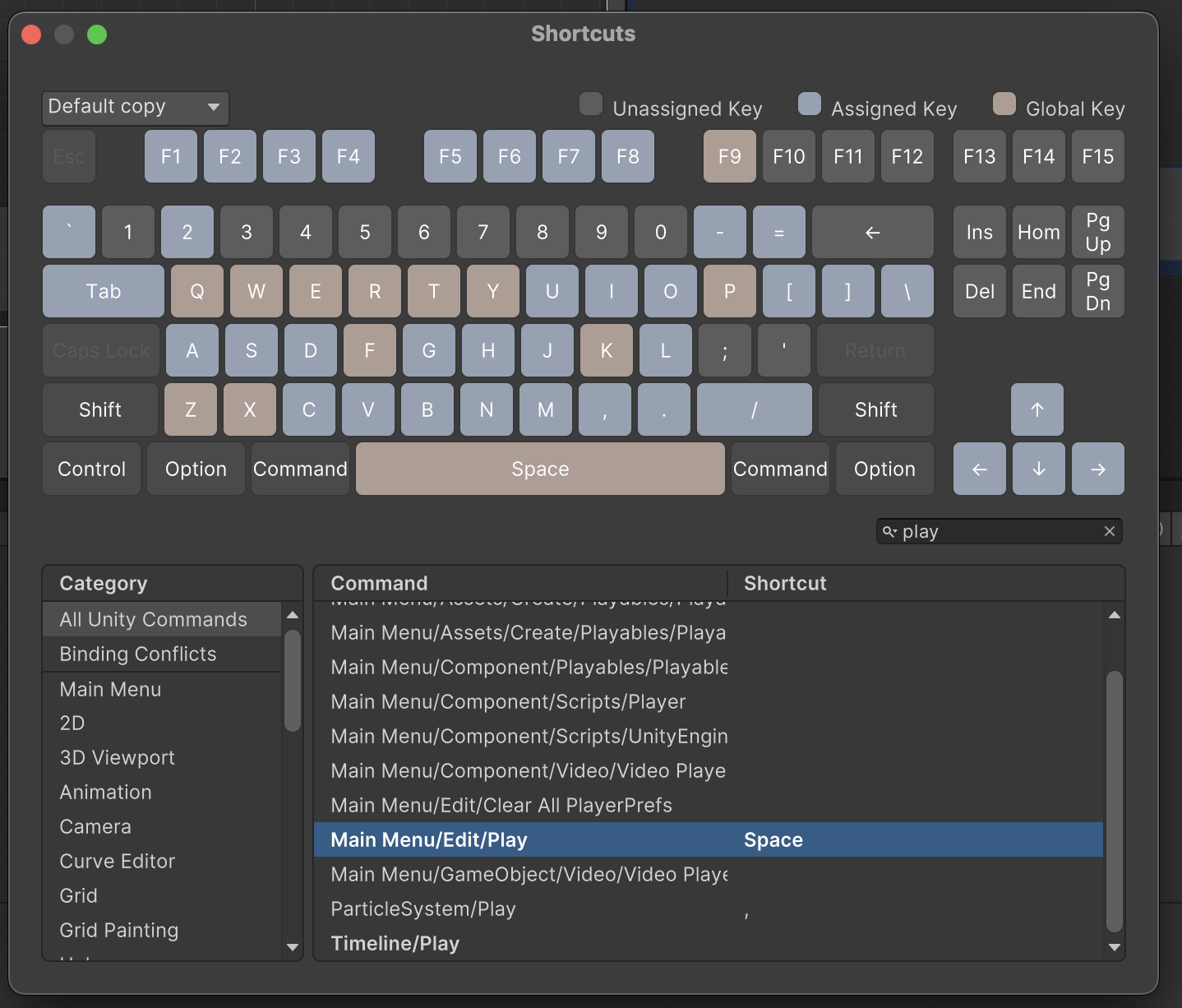 Main Menu/Edit/Play -> 유니티 플레이에 해당하는 커맨드입니다. 이번에 스페이스로 편하게 유니티 플레이를 작동시키는게 목적입니다.