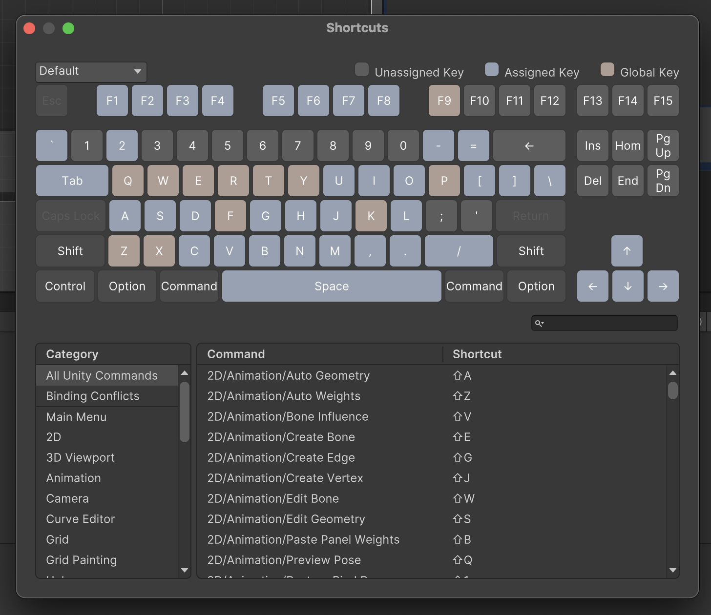 기본적으로 구성되어있는 단축키들을 살펴 볼 수 있습니다. 할당되어 있는 키가 있는 반면 할당되어 있지 않은 키들도 확인 할 수 있습니다.